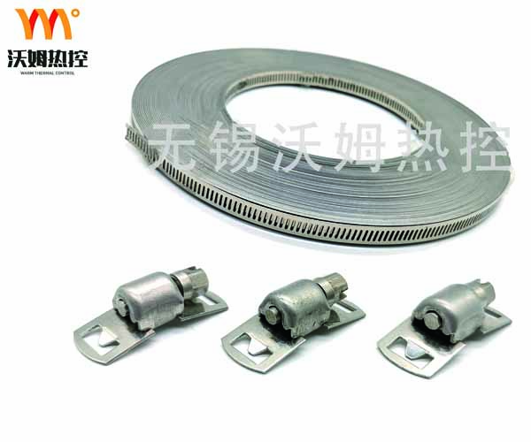 由10mm寬1.0mm厚連續(xù)長度的 不銹鋼扎帶 以及固定螺絲所組成。它可以將接線盒等附件固定在管道上。